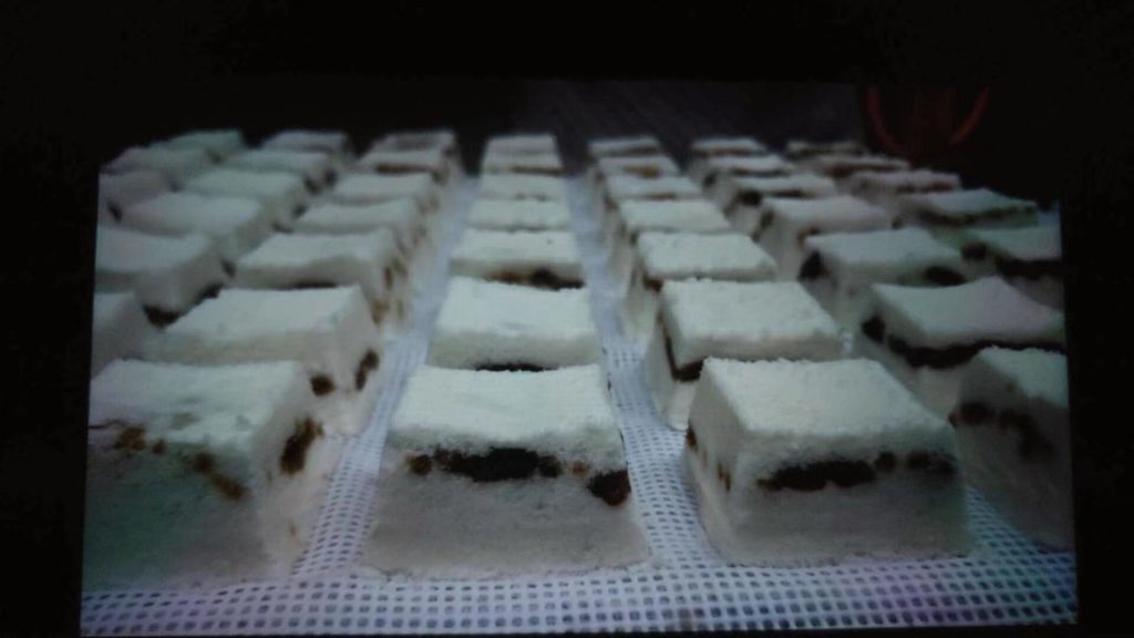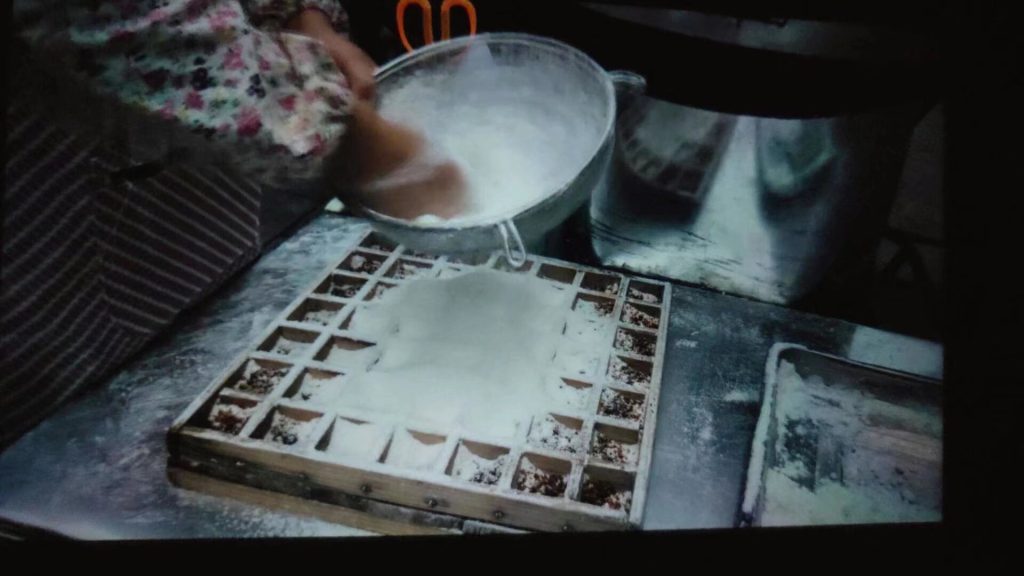 他们先用网筛将细腻的甜面粉选出,再撒一层干桂花,黑白之隙加以红糖点缀;