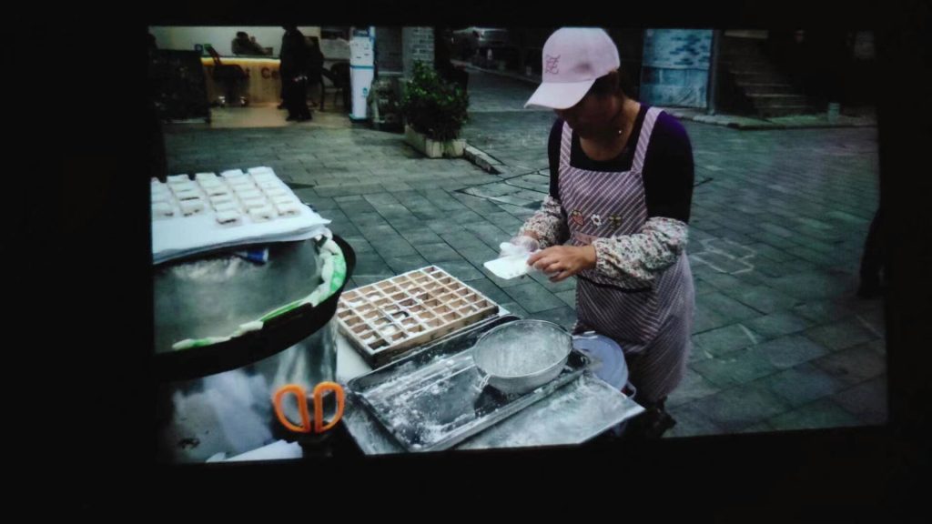 (采访的人叫阳陆妹,之前在象鼻山门口摆摊,后来“市容政治”,只得在东西巷的状元廊里每天躲着城管偷偷卖她的桂花糕。怎么说呢,从小到大,只吃过她的桂花糕是软糯的,其他的不是硬就是干。据说她的甜面粉是用石墨手磨的——当时还计划着第二期去拍桂花糕的出生记,看她怎么选米、磨米——桂花也是自己摘的。记得那时八九度的大冷天,顶着密雨拍了半天也没什么特别满意的片子,不抱希望地和这个没见几个人买的桂花糕摊老板娘聊了一下,结果越听越来劲。回想起来,她的桂花糕做的非常出色,但是没几个人买,因为在旅游团来的时候,10秒不到就会全部从她旁边走过,所以她也只能强调一句:“我这的桂花糕和其他人的不一样的,你吃吃看就知道了”。而这相比较那些装修比莫府还豪华的店铺来说,她的语言就显得很苍白;被骗过无数次的游客也自然不会买单。但是真正讽刺的是,前段时间我们正绞尽脑汁想着用什么元素让东西巷的西巷盘活起来,遇到的最大难题就是怎么找到既能代表桂林又能蹭流量的能与客人互动的人才。而当时项目方只找到一个与桂林毫无关联的“土行孙”,一个玩金箍棒很厉害的残疾人,准备让他来吸引年轻人。)